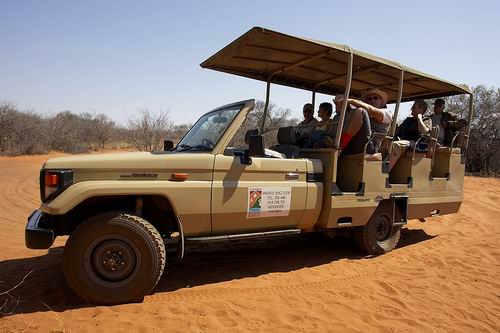 Harald hat das große Vergnügen zwischen zwei Jägern sitzen zu dürfen ;-) Ganz sicher sind wir uns zwar nicht, aber da ihre einzigen Kommentare bislang die Schmackhaftigkeit der gesichteten Tiere zum Inhalt hatten und sie sich später an den befestigten Beobachtungsstellen auch mehr für die dort hängenden Gehörne und Schädel der Antilopen als für das beobachten der Tiere an den Wasserstellen (OK, OK es gab ja auch nicht viel zu sehen, dazu aber später) interessierten, liegt der Verdacht einfach nahe. Ach ja: Sie sind auch die einzigen, die in ihren Westen Bier(-dosen) dabei haben...es waren ganz sicher Jäger!