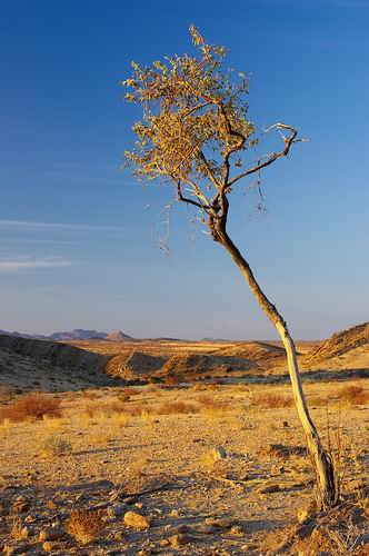 Gegen 16.30 Uhr starten wir unsere Abendwanderung auf dem Klipspringer Trail. Als wir aus dem Bungalow kommen, wartet "Cher", die jüngere der beiden Hunde, schon auf uns. Sie liebt es mit den Gästen wandern zu gehen und hat irgendwie gerochen, dass die beiden Kasper aus Deutschland noch ne kleine Wanderung unternehmen könnten. Wahrscheinlich hat sie gerochen, dass wir unsere Wanderstiefel ausgepackt haben. Für eine Hundenase dürften vor allem Haralds Schuhe schon Kilometer weit wahrnehmbar sein. Also machen wir uns zusammen mit ihr auf den weg. Sie freut sich sichtbar darüber und rennt die meiste Zeit weit vor uns her. Als sie merkt, welchen Weg wir gehen wollen, bleibt sie oftmals genau an der richtigen Stelle stehen, um uns den Weg zu zeigen. Die Landschaft ist wunderschön. Viele Felsen, natürlich viel Sand und jede Menge interessanter Bäume begleiten unseren Weg.