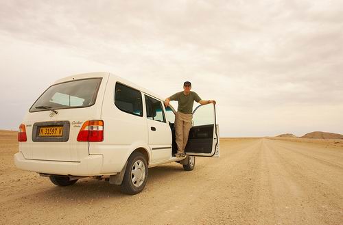 In Karibib wird noch getankt und dann geht's auf den "Trans Kalahari Highway" Richtung Küste/Swakopmund. Die Fahrt verläuft ohne Zwischenfälle (nur das Wetter ist sehr schlecht und der Himmel stark bewölkt) und uns fällt auf, das der Verkehr hier größer ist als auf allen anderen Straßen. Das bedeutet aber nur, dass wir ab und zu mal ein Auto oder einen Laster sehen. Stau ist wohl ein Wort, das im namibianischen Wortschatz sicher fehlt.