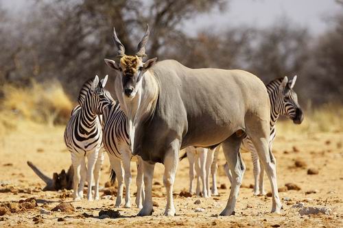 Fotos > Tiere > Huftiere > Elenantilopen > Größenvergleich mit ausgewachsenen Zebras (Etosha)